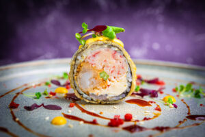Kuldses tempuras kanarull siidise juustu ja frillis-salatiga, kerge spaisi kastmega (sisaldab masagot), seesamiseemned
